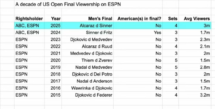美网11年决赛平均收视女胜男,辛纳和阿卡会师非赞助商心中所愿